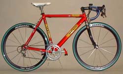 フレーム:EVERWIN・オーダーフレーム パイプ:EASTONアルミウルトラライト&エアロアルミメガパイプ パーツ:CAMPAGNOLOレコード ホィール:CAMPAGNOLOシャーマルディープリム タイヤ:ミシュラン・アクシアルプロ700x20C バー:ITMプロ225(420mm) ステーム:BIGワン120mm ペダル:LOOK996 サドル:VETTAレーシングSL |