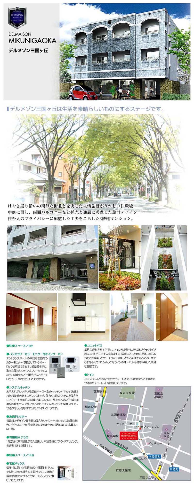 けやき通りの閑静な町並みと充実した生活施設がうれしい住環境中庭に面し、両面バルコニーなど採光と通風に考慮した設計デザイン、住む人のプライバシーに配慮した工夫をこらした3階建てマンションです!